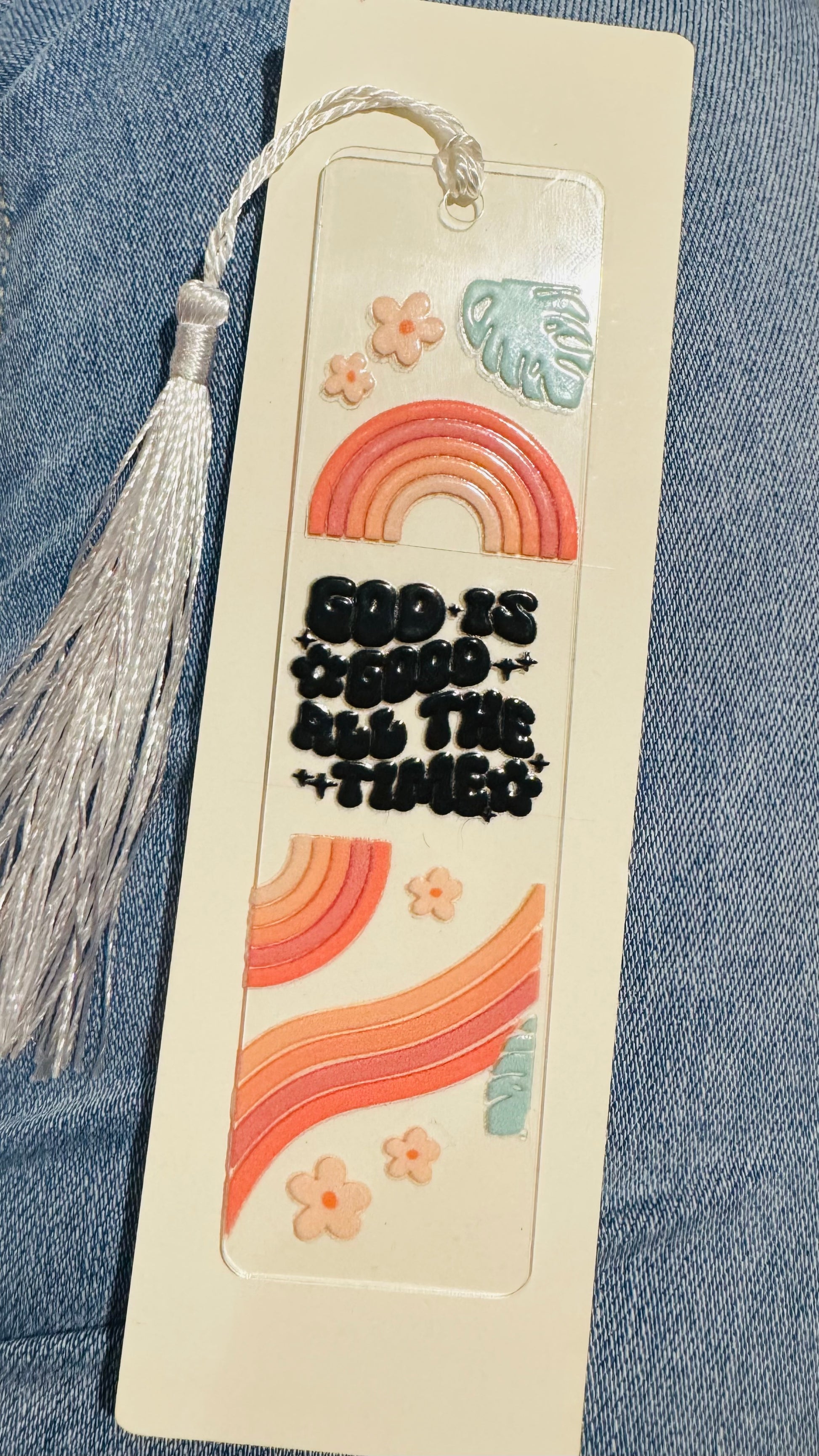 "God Is Good All The Time" Acrylic Bookmark with Boho Rainbow & Tassel