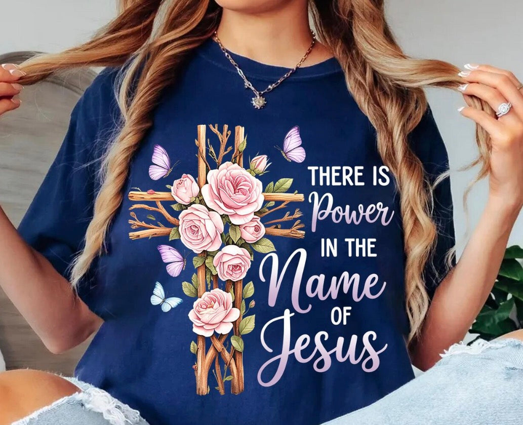 Express your faith with beauty and grace in our Power in the Name of Jesus Tee. This design features a stunning, rustic wooden cross adorned with soft pink roses and delicate butterflies, paired with a powerful message that serves as a constant reminder of strength and hope.