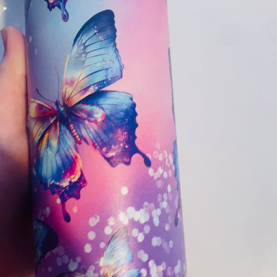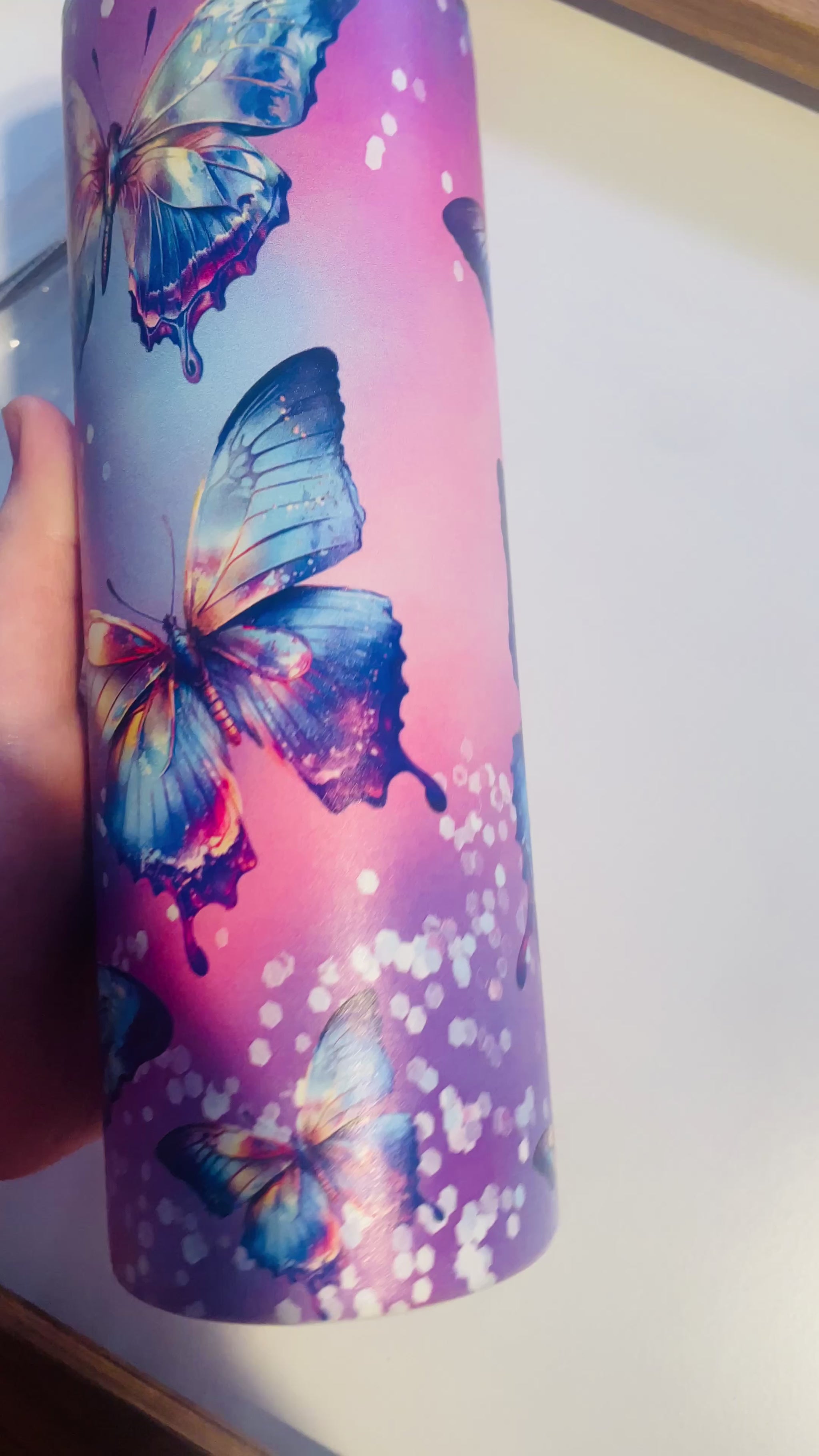 This 20oz tumbler features a delicate butterfly design, adding a touch of beauty to your everyday beverage experience. Its 20oz capacity ensures you have enough to drink while on the go. Enjoy stylish and functional hydration with this tumbler.